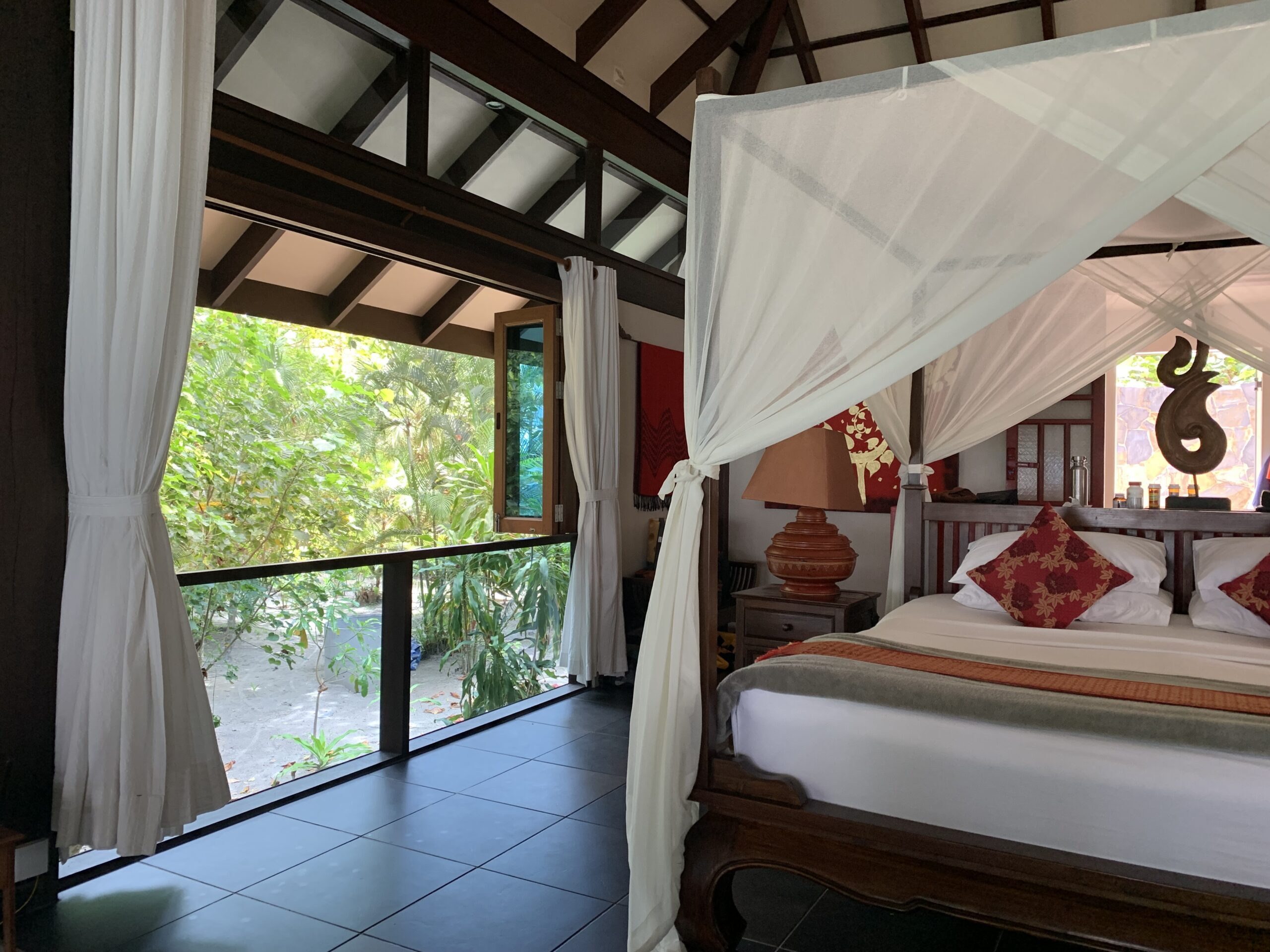 We are currently on Koh Jum, a small island off Krabi in southern Thailand. We took a car from the Krabi airport to a fishermen’s pier outside the city, then a longtail boat over to the island. It was about an hour from the airport to the pier and about 40 minutes to cross the water. Our first two weeks we rented a beachfront cottage at Koh Jum Beach Villas. What a great place to stay! We had a lovely villa—private pool, kitchen, main room, dining area, outdoor shower…